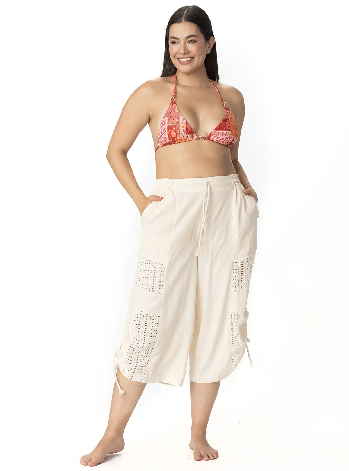 Diseño con detalles calados tipo ojillo y bolsillos funcionales laterales y posteriores que realzan su estilo artesanal.