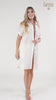VESTIDO BLUSÓN MIDI EN ALGODÓN MARFIL CON RAYAS TEJIDAS EN HILOS DORADOS. 8183